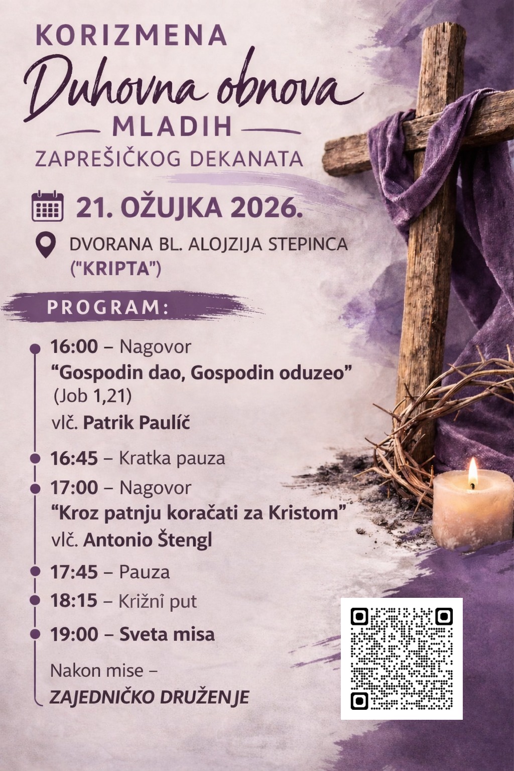 U subotu, 21. ožujka 2026. godine, održat će se korizmena duhovna obnova namijenjena mladima Zaprešićkog dekanata. Susret će se održati u dvorani bl. Alojzija Stepinca, poznatijoj kao “Kripta”, s početkom